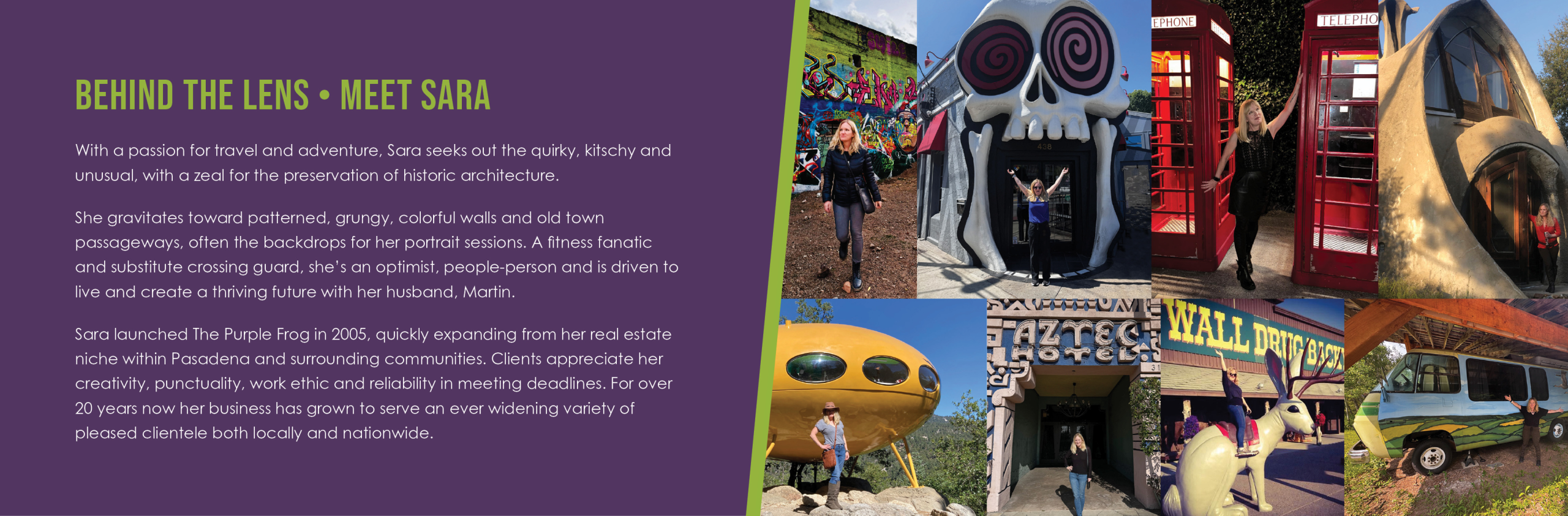 Sara launched The Purple Frog in 2005, quickly expanding from her real estate niche within Pasadena and surrounding communities. Clients appreciate her creativity, punctuality, work ethic and reliability in meeting deadlines. For over 20 years now her business has grown to serve an ever widening variety of pleased clientele both locally and nationwide.
