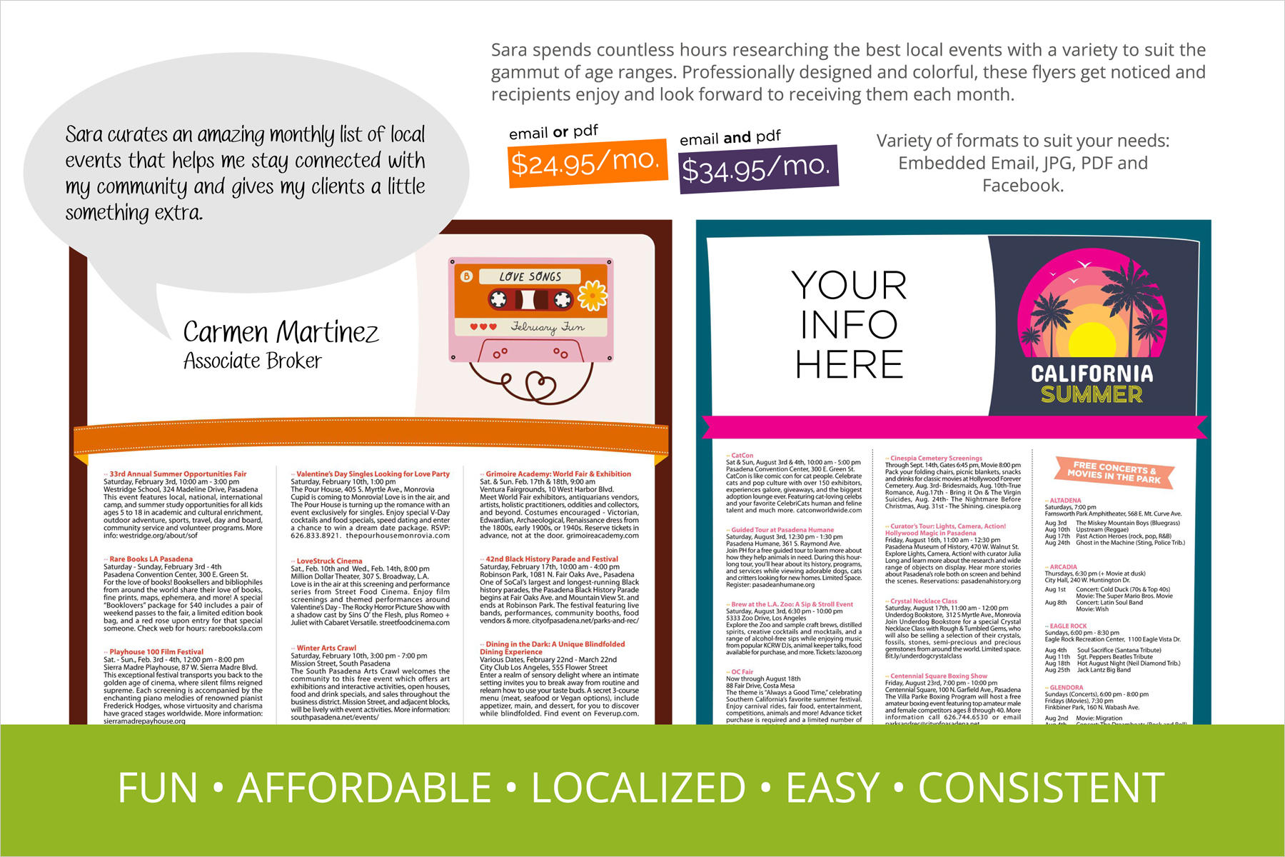 Local event flyers and emails are an affordable tool to stay in front of your clients or prospective clients every month. You can also opt for printed event flyers or postcards for door knocking, mailings and open houses.